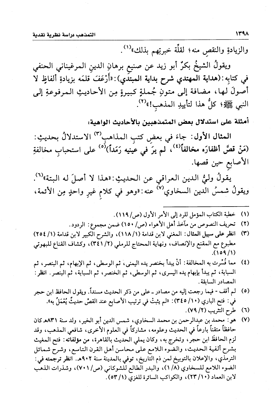 ويقولُ الشيخُ بكرٌ أبو زيد عن صنيعِ برهانِ الدينِ المرغيناني الحنفي في كتابِه: (هداية المهتدي شرح بداية المبتدي): "أَرْعَفَ قلمَه بزيادةِ ألفاظٍ لا أصولَ لها، مضافة إلى متونِ جُملةٍ كبيرةٍ مِن الأحاديثِ المرفوعةِ إلى النبي - صلى الله عليه وسلم -؛ كلُّ هذا لتأييدِ المذهبِ! " (¬٢).