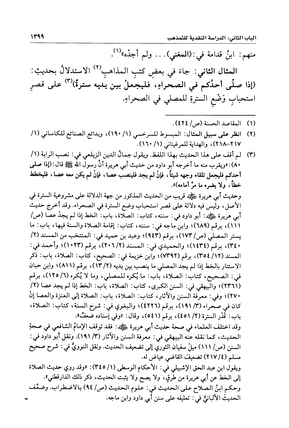 (¬٣) لم أقف على هذا الحديث بهذا اللفظ. ويقول جمالُ الدين الزيلعي في: نصب الراية (١/ ٨٥): "ويقرب منه ما أخرجه أبو داود من حديث أبي هريرة أنَّ رسول الله - صلى الله عليه وسلم - قال: (إذا صلى أحدكم فليجعل تلقاء وجهه شيئًا، فإنْ لم يجد فلينصب عصا، فإنْ لم يكن معه عصا، فليخطط خطًا، ولا يضره ما مرَّ أمامه) ".