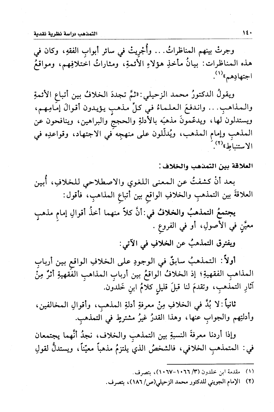 أولًا: التمذهبُ سابقٌ في الوجودِ على الخلافِ الواقعِ بين أربابِ المذاهب الفقهيةِ؛ إذ الخلافُ الواقعُ بين أرباب المذاهبِ الفقهيةِ أثرٌ مِنْ آثارِ التمَذهبِ، وتقدمَ لنا قبلَ قليلٍ كلامُ ابنِ خَلدَون.