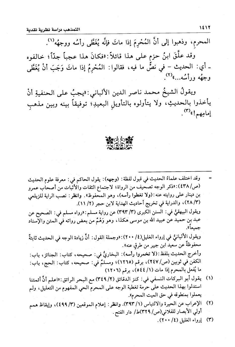 (¬١) يقول أبو البركات النسفي في: كنز الدقائق (٢/ ٣٤٩) مع البحر الرائق: "اعلم أن أئمتنا استدلوا بهذا الحديث على حرمة تغطية الوجه على المحرم الحي المفهوم من التعليل، ولم يعملوا بمنطوقه في حق الميت المحرم".