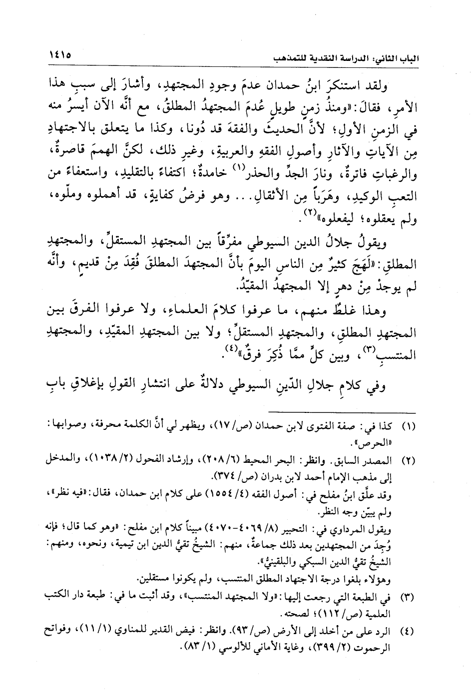 ولقد استنكرَ ابنُ حمدان عدمَ وجودِ المجتهدِ، وأشارَ إلى سببِ هذا الأمرِ، فقالَ: "ومنذُ زمنِ طويلِ عُدمَ المجتهدُ المطلقُ، مع أنَّه الآن أيسرُ منه في الزمنِ الأولِ؛ لأنَّ الحديثَ والفقهَ قد دُونا، وكذا ما يتعلق بالاجتهادِ مِن الآياتِ والآثارِ وأصولِ الفقهِ والعربيةِ، وغيرِ ذلك، لكنَّ الهممَ قاصرةٌ، والرغباتِ فاترةٌ، ونارَ الجدِّ والحذر (¬١) خامدةٌ؛ اكتفاءً بالتقليدِ، واستعفاءً من التعبِ الوكيدِ، وهَرَبًا مِن الأثقالِ ... وهو فرضُ كفايةٍ، قد أهملوه وملّوه، ولم يَعقلوه؛ ليفعلوه" (¬٢).