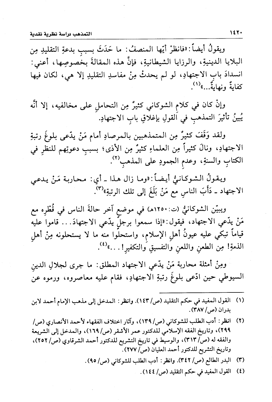 وإنْ كان في كلامِ الشوكاني كثيرٌ مِن التحاملِ على مخالفيه، إلا أنَّه يُبينُ تأثيرَ التمذهبِ في القولِ بإغلاقِ بابِ الاجتهادِ.