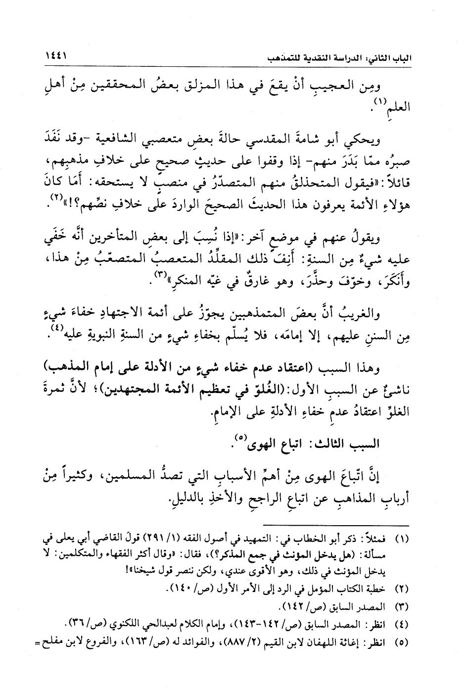 والغريبُ أنَّ بعضَ المتمذهبين يجوّزُ على أئمة الاجتهادِ خفاءَ شيءٍ مِن السننِ عليهم، إلا إمامَه، فلا يُسلّم بخفاءِ شيءٍ من السنةِ النبويةِ عليه (¬٤).