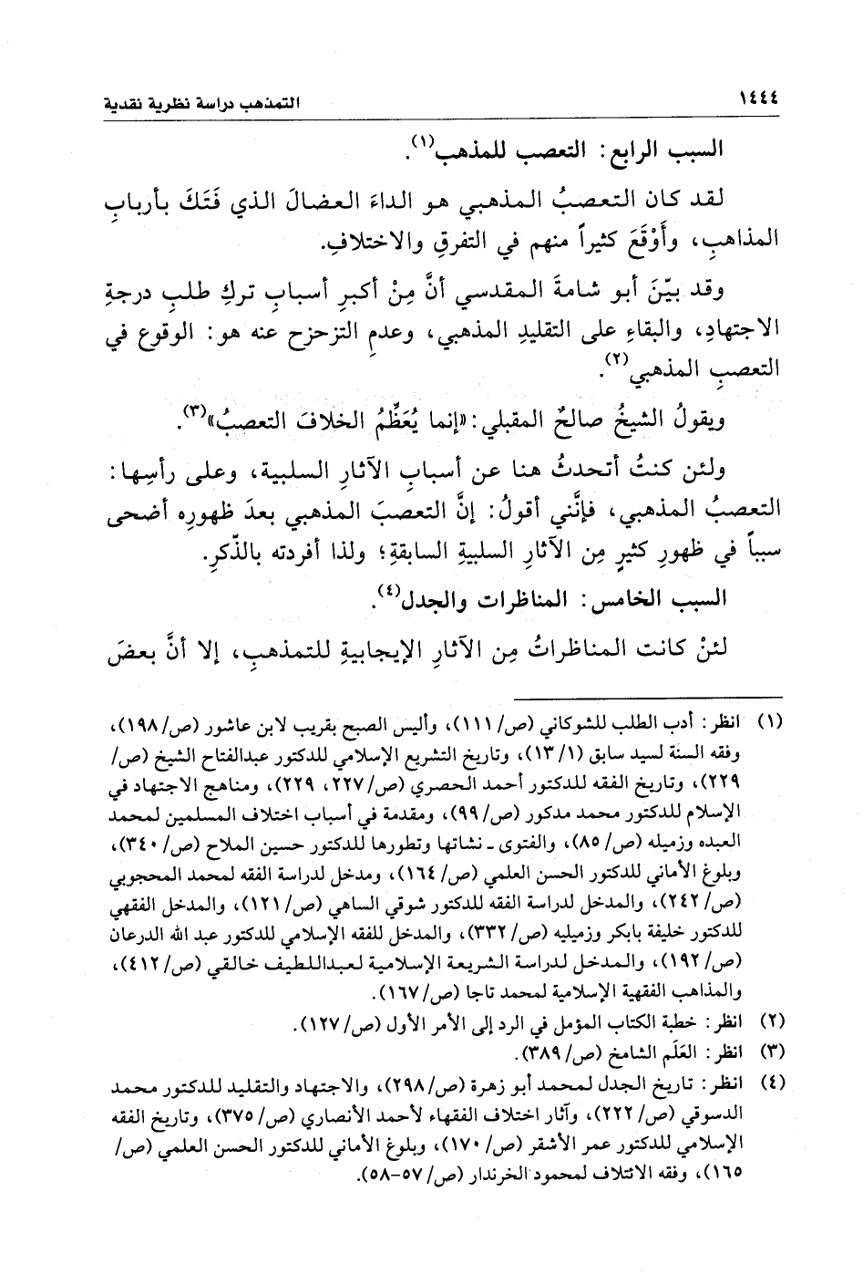 وقد بيّنَ أبو شامةَ المقدسي أنَّ مِنْ أكبرِ أسبابِ تركِ طلب درجةِ الاجتهادِ، والبقاءِ على التقليدِ المذهبي، وعدمِ التزحزح عنه هو: الوَقوع في التعصبِ المذهبي (¬٢).