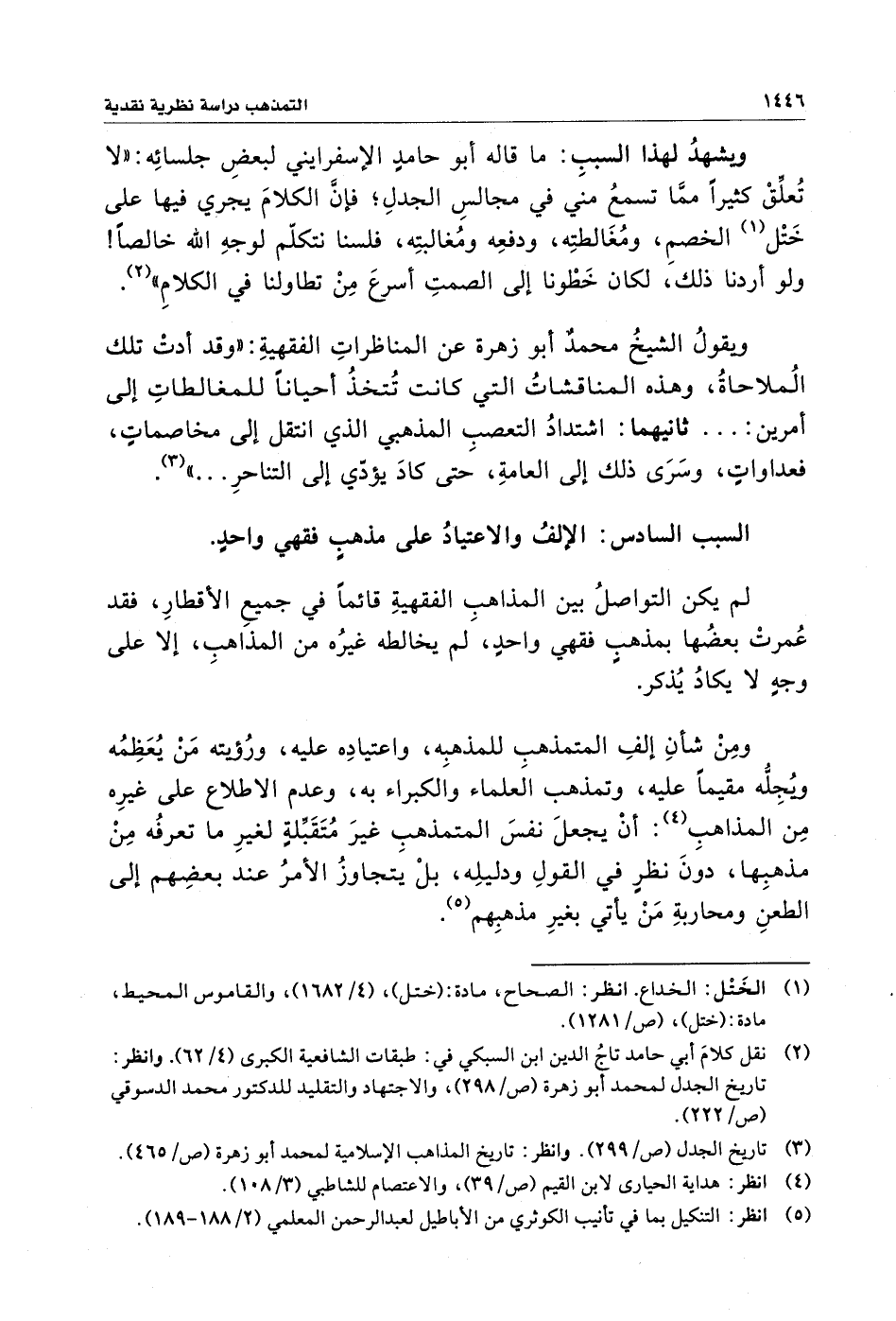 ويقولُ الشيخُ محمدٌ أبو زهرة عن المناظراتِ الفقهيةِ: "وقد أدتْ تلك المُلاحاةُ، وهذه المناقشاتُ التي كانت تُتخذُ أحيانًا للمغالطاتِ إلى أمرين: ... ثانيهما: اشتدادُ التعصبِ المذهبي الذي انتقل إلى مخاصماتٍ، فعداواتٍ، وسَرَى ذلك إلى العامةِ، حتى كادَ يؤدّي إلى التناحرِ ... " (¬٣).