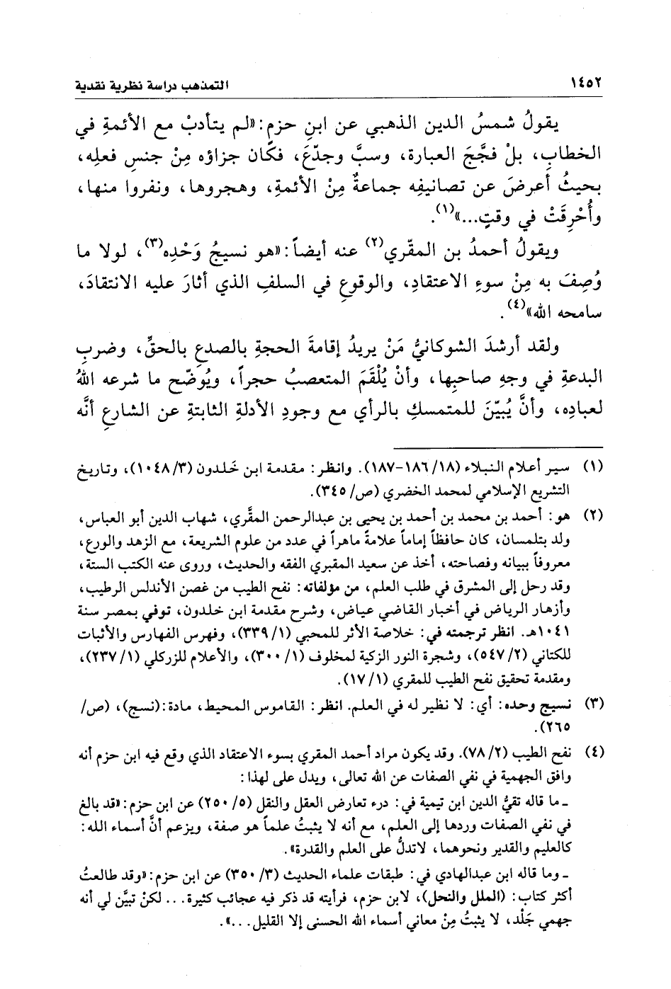 (¬٤) نفح الطيب (٢/ ٧٨). وقد يكون مراد أحمد المقري بسوء الاعتقاد الذي وقع فيه ابن حزم أنه وافق الجهمية في نفي الصفات عن الله تعالى، ويدل على لهذا: