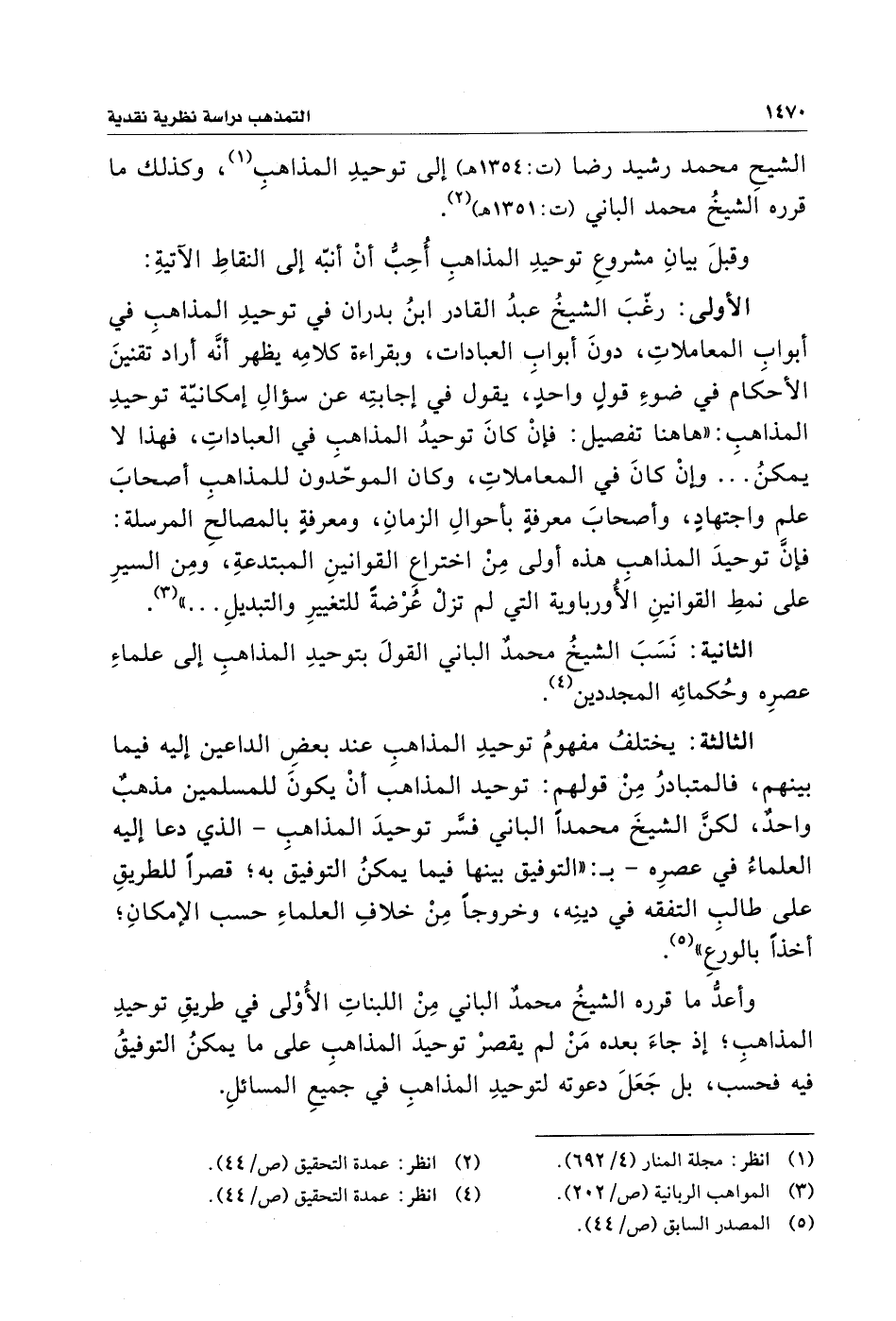 الشيحِ محمد رشيد رضا (ت: ١٣٥٤ هـ) إلى توحيدِ المذاهبِ (¬١)، وكذلك ما قرره الشيخُ محمد الباني (ت: ١٣٥١ هـ) (¬٢).