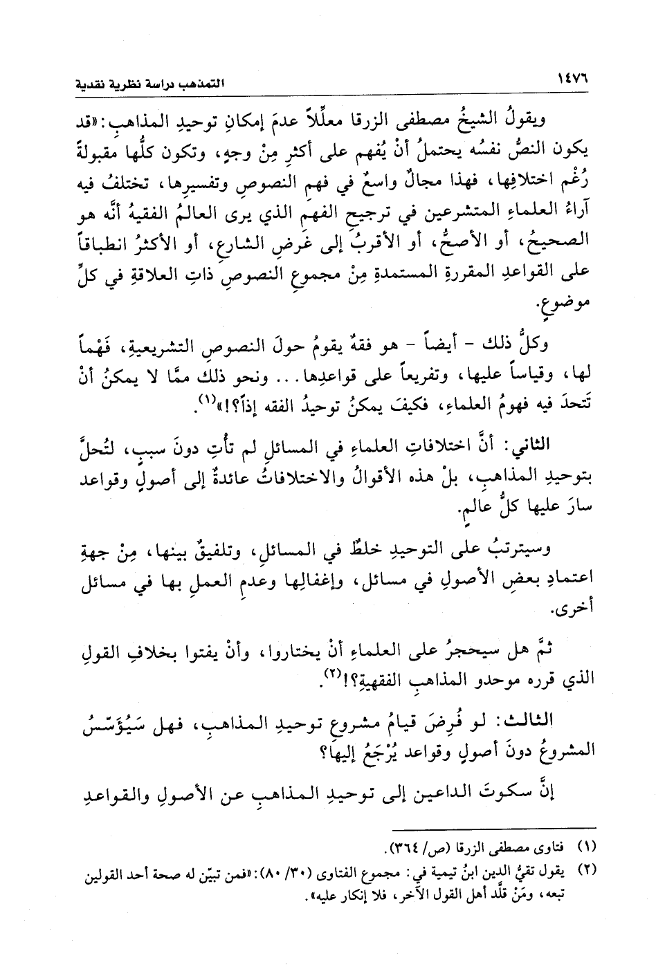 ويقولُ الشيخُ مصطفى الزرقا معلِّلًا عدمَ إمكانِ توحيدِ المذاهبِ: "قد يكون النصُّ نفسُه يحتملُ أنْ يُفهم على أكثرِ مِنْ وجهٍ، وتكون كلُّها مقبولةً رُغْم اختلافِها، فهذا مجالٌ واسعٌ في فهمِ النصوصِ وتفسيرِها، تختلفُ فيه آراءُ العلماءِ المتشرعين في ترجيحِ الفهمِ الذي يرى العالمُ الفقيهُ أنَّه هو الصحيحُ، أو الأصحُّ، أو الأقربُ إلى غرضِ الشارعِ، أو الأكثرُ انطباقًا على القواعدِ المقررةِ المستمدةِ مِنْ مجموعِ النصوصِ ذاتِ العلاقةِ في كلِّ موضوعٍ.