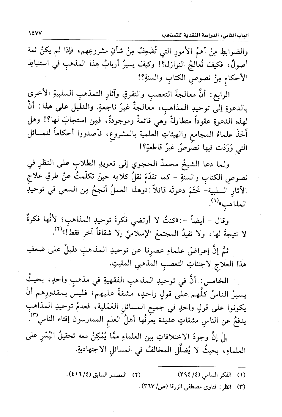 ولما دعا الشيخُ محمدٌ الحجوي إلى تعويدِ الطلاب على النظرِ في نصوصِ الكتاب والسنةِ - كما تقدّمَ نقلُ كلامِه حينَ تكلّمتُ عنْ طرقِ علاجِ الآثارِ السلبية - خَتَمَ دعوتَه قائلًا: "وهذا العملُ أنجحُ مِن السعي في توحيدِ المذاهبِ" (¬١).