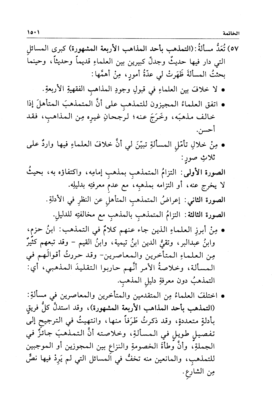 ٥٧) تُعَدُّ مسألةُ: (التمذهب بأحد المذاهب الأربعة المشهورة) كبرى المسائلِ التي دار فيها حديثٌ وجدلٌ كبيرين بين العلماءِ قديمًا وحديثًا، وحينما بحثتُ المسألةَ ظَهَرتْ لي عدّةُ أمورٍ، مِنْ أهمَّها: