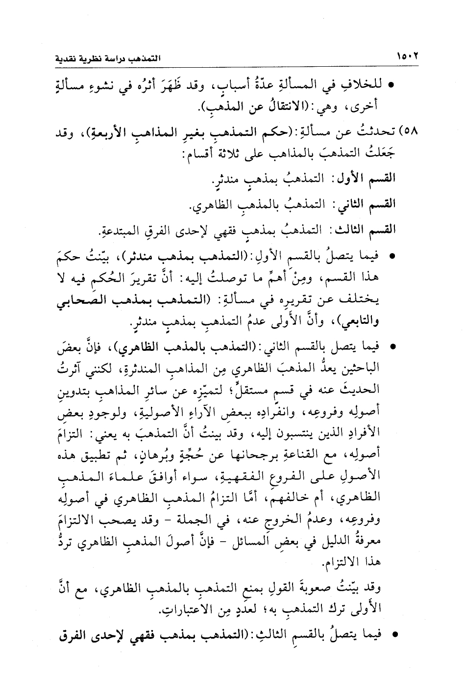 • فيما يتصل بالقسم الثاني: (التمذهب بالمذهب الظاهري)، فإنَّ بعضَ الباحثين يعدُّ المذهبَ الظاهري مِن المذاهبِ المندثرةِ، لكنني آثرتُ الحديثَ عنه في قسمٍ مستقلٍّ؛ لتميّزِه عن سائرِ المذاهبِ بتدوينِ أصولِه وفروعِه، وانفرادِه ببعضِ اللآراءِ الأصوليةِ، ولوجودِ بعضِ الأفرادِ الذين ينتسبون إليه، وقد بينتُ أنَّ التمذهبَ به يعني: التزامَ أصولِه، مع القناعةِ برجحانها عن حُجِّةٍ وبُرهانٍ، ثم تطبيق هذه الأصولِ على الفروعِ الفقهيةِ، سواء أوافقَ علماءَ المذهبِ الظاهري، أم خالفهم، أمَّا التزامُ المذهبِ الظاهري في أصولِه وفروعِه، وعدمُ الخروجِ عنه، في الجملة - وقد يصحب الالتزامَ معرفةُ الدليل في بعضِ المسائل - فإنَّ أصولَ المذهب الظاهري تردُّ هذا الالتزام.