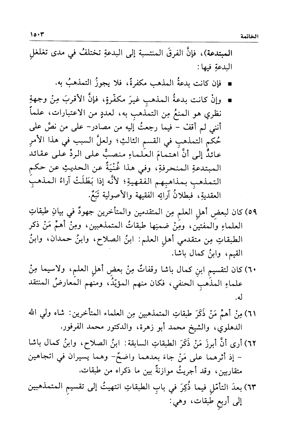 ٦١) مِنْ أهمِّ مَنْ ذَكَرَ طبقاتِ المتمذهبين مِن العلماء المتأخرين: شاه ولي الله الدهلوي، والشيخ محمد أبو زهرة، والدكتور محمد الفرفور.