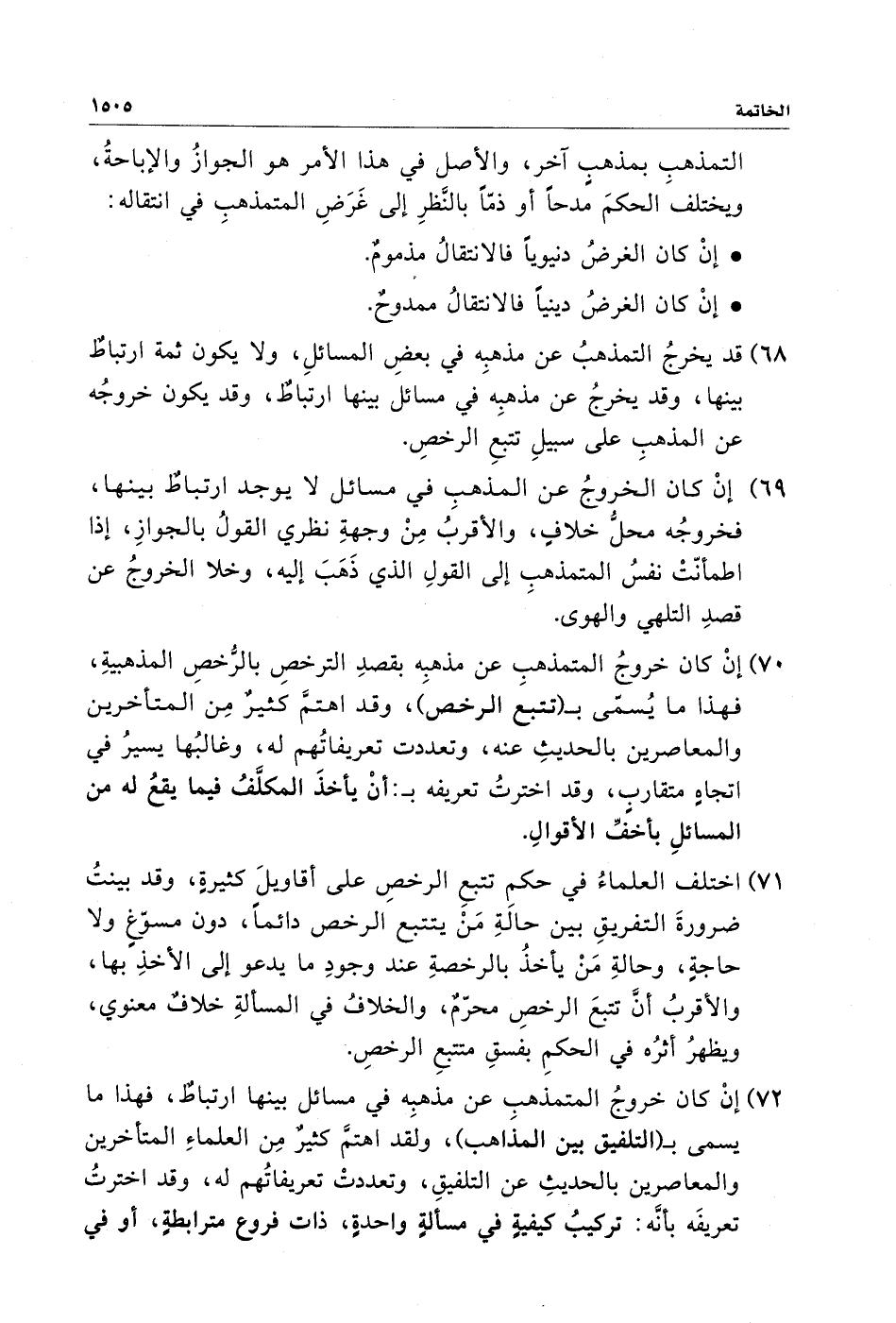 ٦٨) قد يخرجُ التمذهبُ عن مذهبِه في بعضِ المسائلِ، ولا يكون ثمة ارتباطٌ بينها، وقد يخرجُ عن مذهبِه في مسائلَ بينها ارتباطٌ، وقد يكون خروجُه عن المذهبِ على سبيلِ تتبعِ الرخصِ.