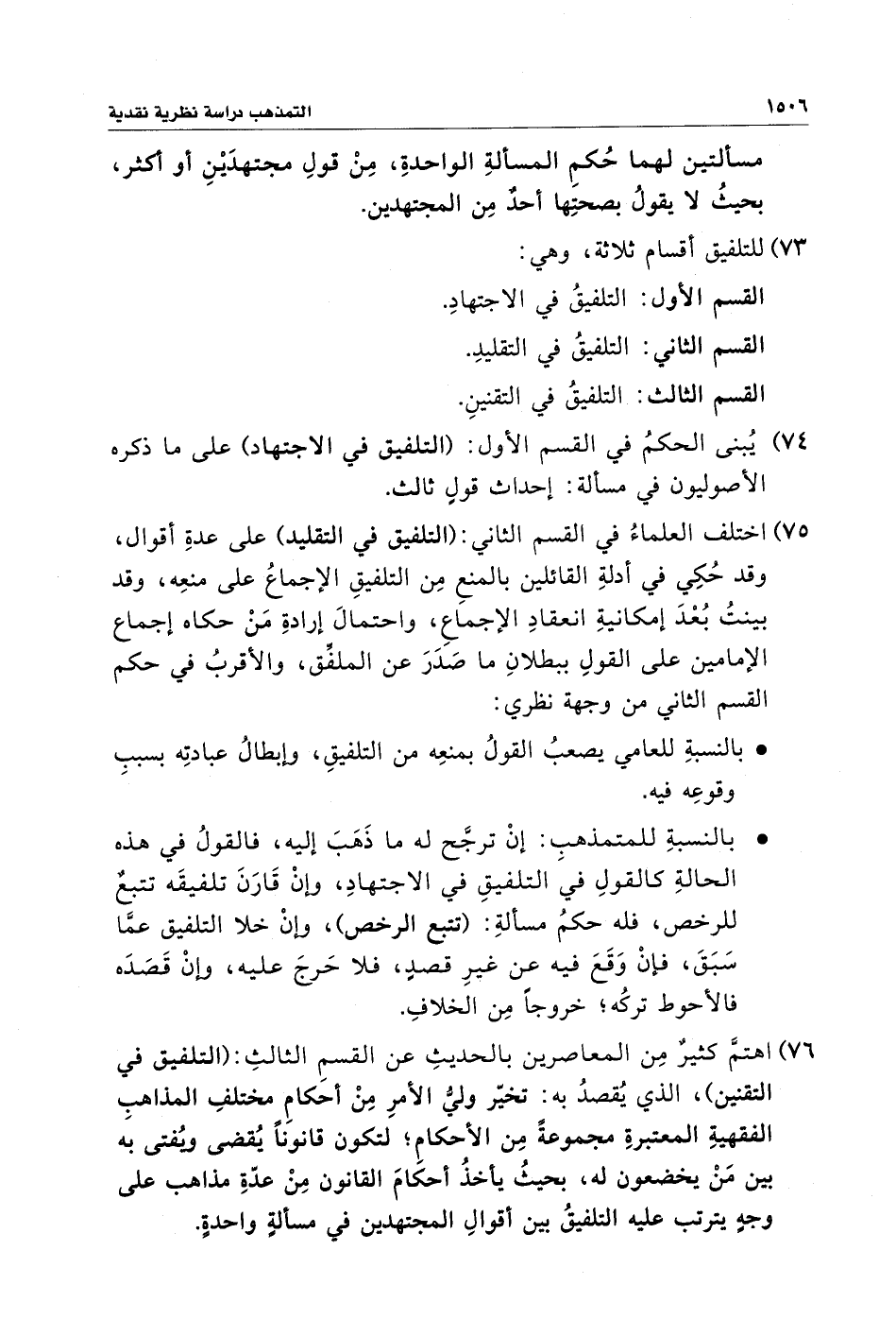 ٧٤) يُبنى الحكمُ في القسم الأول: (التلفيق في الاجتهاد) على ما ذكره الأصوليون في مسألة: إحداث قولٍ ثالث.
