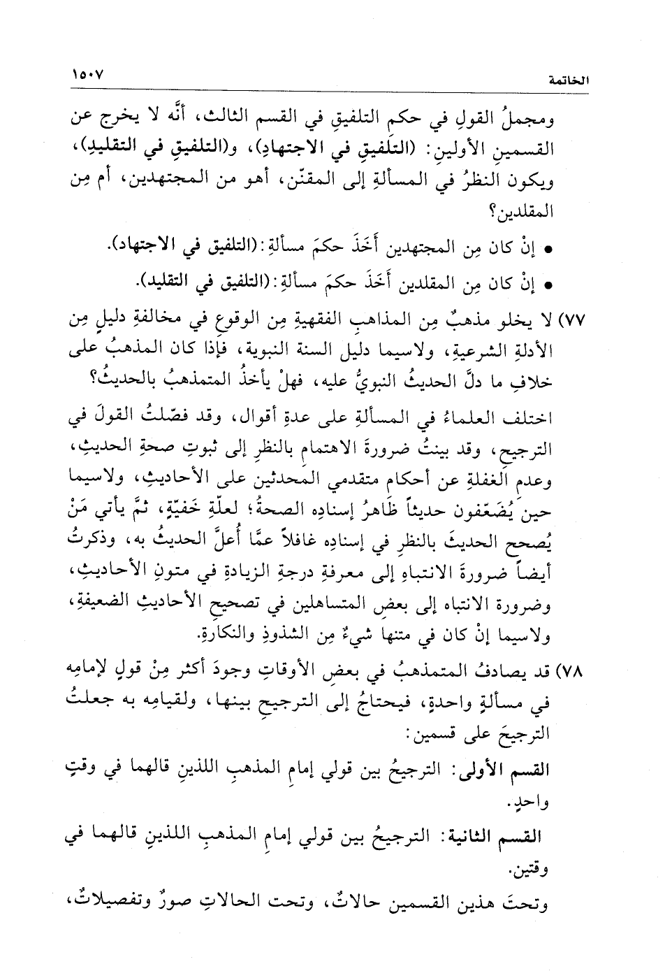٧٨) قد يصادفُ المتمذهبُ في بعضِ الأوقاتِ وجودَ أكثر مِنْ قولٍ لإمامِه في مسألةٍ واحدةٍ، فيحتاجُ إلى الترجيحِ بينها، ولقيامِه به جعلتُ الترجيحَ على قسمين: