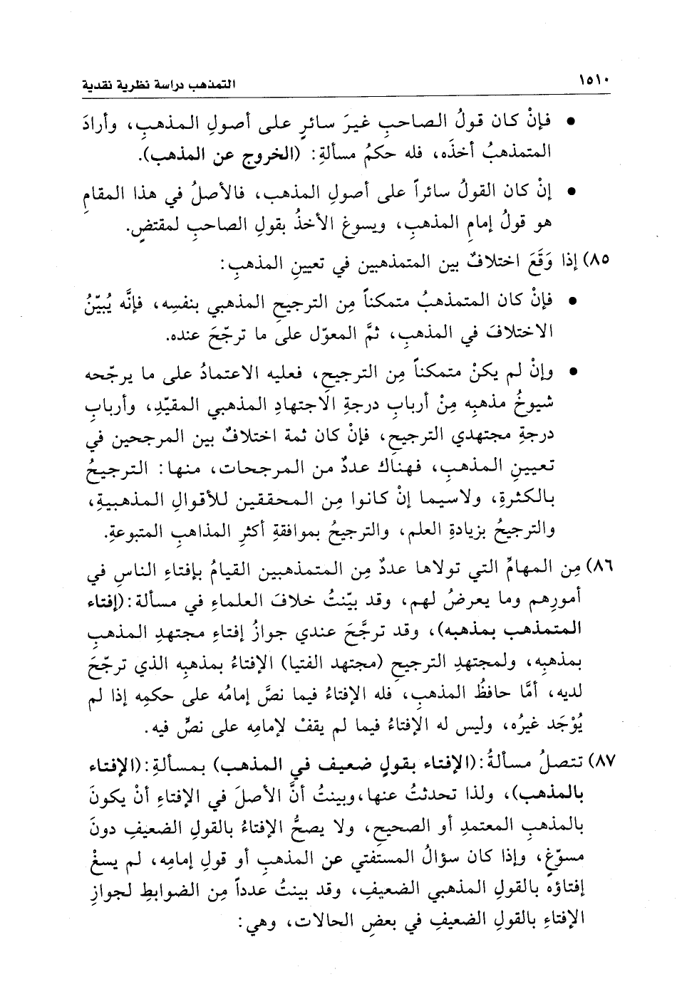٨٦) مِن المهائم التي تولاها عددٌ مِن المتمذهبين القيامُ بإفتاءِ الناسِ في أمورِهم وما يعرضُ لهم، وقد بيّنتُ خلافَ العلماءِ في مسألة: (إفتاء المتمذهب بمذهبه)، وقد ترجَّحَ عندي جوازُ إفتاءِ مجتهدِ المذهبِ بمذهبِه، ولمجتهدِ الترجيحِ (مجتهد الفتيا) الإفتاءُ بمذهبِه الذي ترجّحَ لديه، أمَّا حافظُ المذهبِ، فله الإفتاءُ فيما نصَّ إمامُه على حكمِه إذا لم يُوْجَد غيرُه، وليس له الإفتاءُ فيما لم يقفْ لإمامِه على نصٍّ فيه.