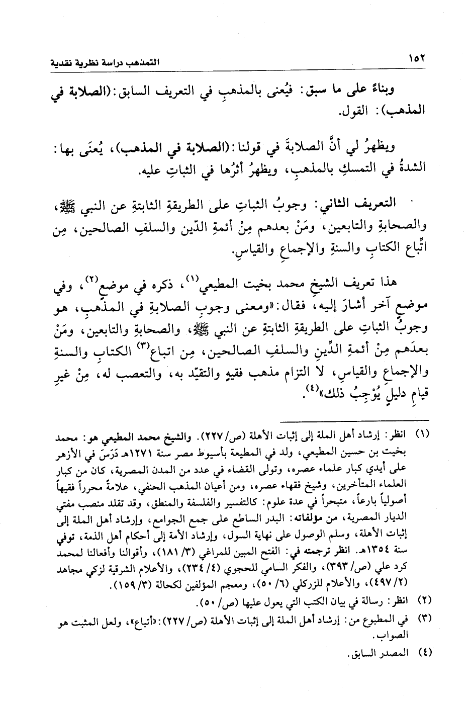 هذا تعريف الشيخِ محمد بخيت المطيعي (¬١)، ذكره في موضعٍ (¬٢)، وفي موضعٍ آخر أشارَ إليه، فقال: "ومعنى وجوب الصلابةِ في المذَهبِ، هو وجوبُ الثباتِ على الطريقةِ الثابتةِ عن النبي - صلى الله عليه وسلم -، والصحابةِ والتابعين، ومَنْ بعدَهم مِنْ أئمةِ الدِّينِ والسلفِ الصالحين، مِن اتباع (¬٣) الكتاب والسنةِ والإجماعِ والقياسِ، لا التزام مذهب فقيهٍ والتقيّد به، والتعصب له، مِنْ غيرِ قيامِ دليلٍ يُوْجِبُ ذلك" (¬٤).