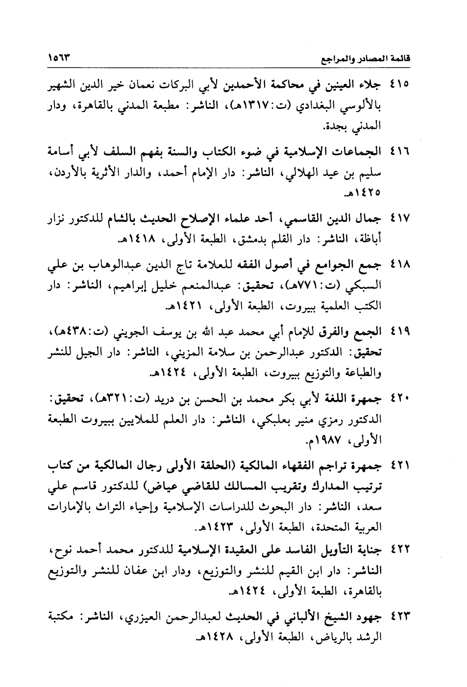 ٤١٦ - الجماعات الإسلامية في ضوء الكتاب والسنة بفهم السلف لأبي أسامة سليم بن عيد الهلالي، الناشر دار الإمام أحمد، والدار الأثرية بالأردن، ١٤٢٥ هـ.