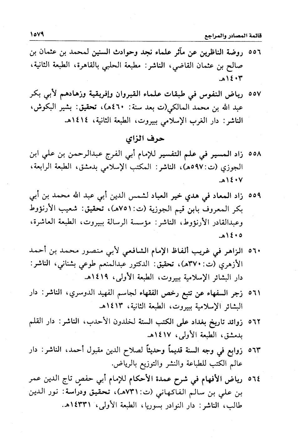 ٥٥٩ - زاد المعاد في هدي خير العباد لشمس الدين أبي عبد الله محمد بن أبي بكر المعروف بابن قيم الجوزية (ت: ٧٥١ هـ)، تحقيق: شعيب الأرنؤوط وعبد القادر الأرنؤوط، النا شر: مؤسسة الرسالة ببيروت، الطبعة العاشرة، ١٤٠٥ هـ.