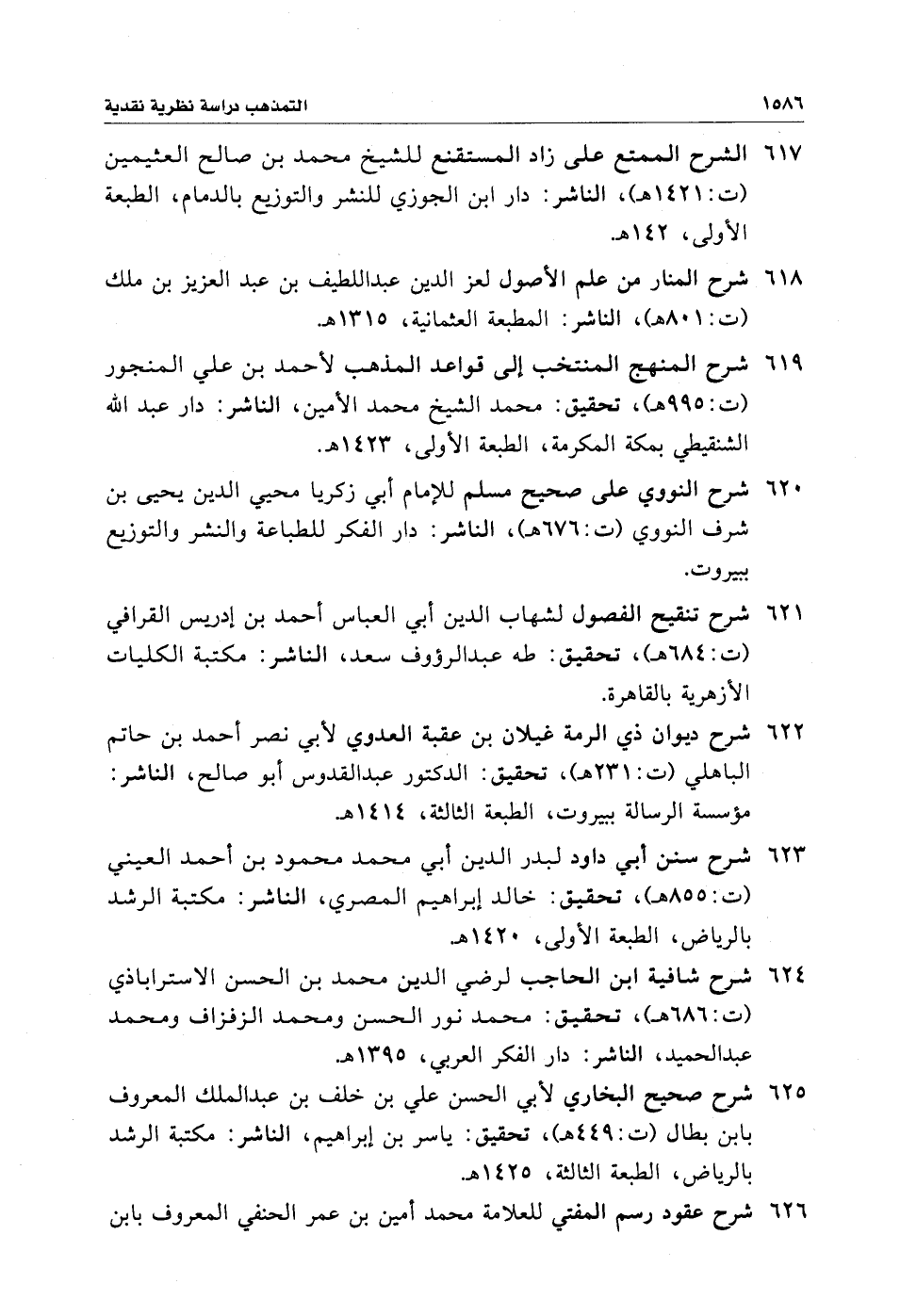 ٦١٩ - شرح المنهج المنتخب إلى قواعد المذهب لأحمد بن علي المنجور (ت: ٩٩٥ هـ)، تحقيق: محمد الشيخ محمد الأمين، الناشر: دار عبد الله الشنقيطي بمكة المكرمة، الطبعة الأولى، ١٤٢٣ هـ.