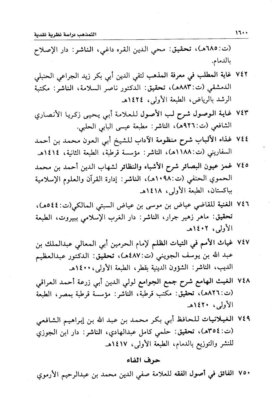 ٧٤٧ - غياث الأمم في التياث الظلم لإمام الحرمين أبي المعالي عبد الملك بن عبد الله بن يوسف الجويني (ت: ٤٨٧ هـ)، تحقيق: الدكتور عبد العظيم الديب، الناشر: الشؤون الدينية بقطر، الطبعة الأولى، ١٤٠٠ هـ.
