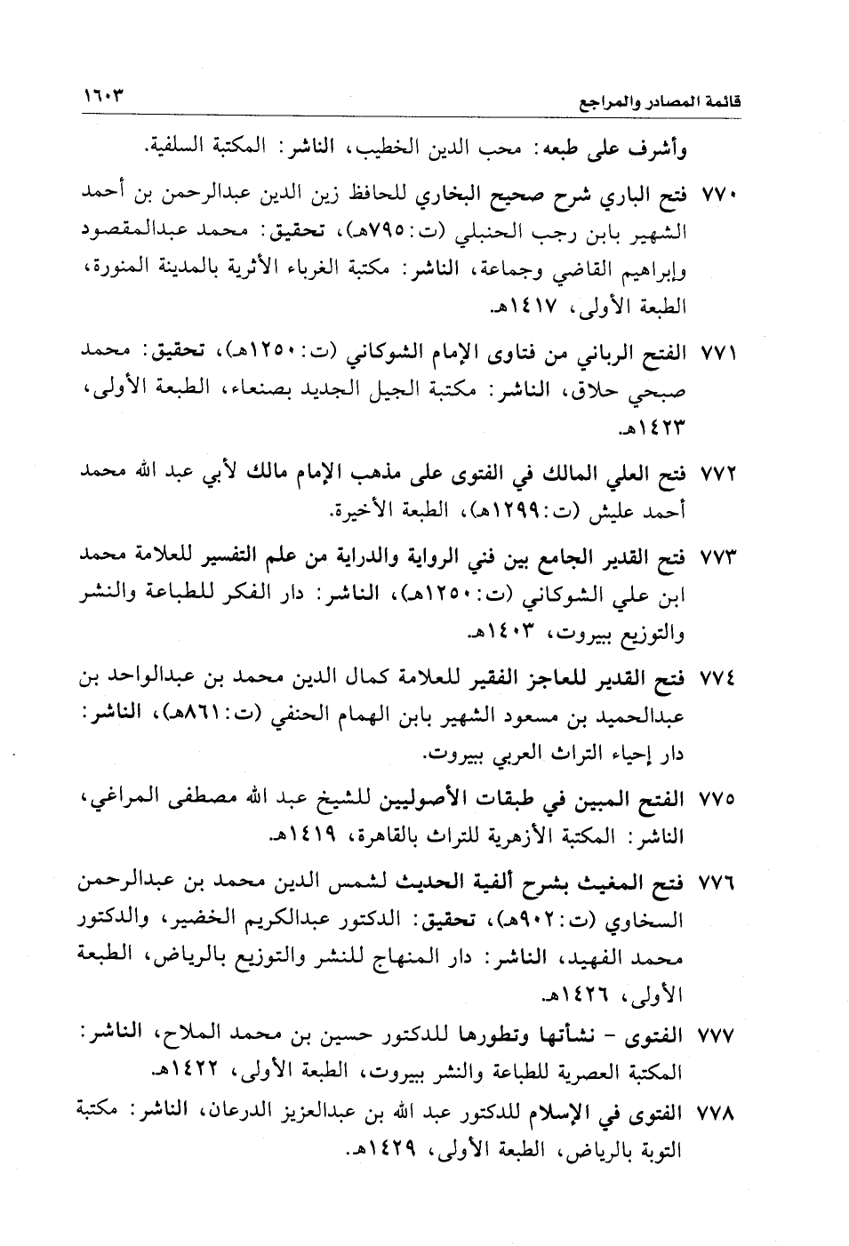 ٧٧١ - الفتح الرباني من فتاوى الإمام الشوكاني (ت: ١٢٥٠ هـ)، تحقيق: محمد صبحي حلاق، الناشر: مكتبة الجيل الجديد بصنعاء، الطبعة الأولى، ١٤٢٣ هـ.