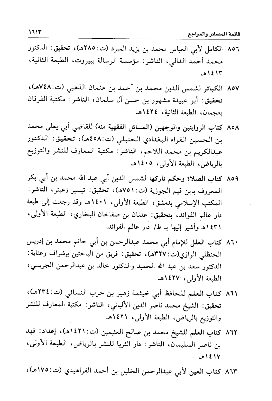 ٨٥٩ - كتاب الصلاة وحكم تاركها لشمس الدين أبي عبد الله محمد بن أبي بكر المعروف بابن قيم الجوزية (ت: ٧٥١ هـ)، تحقيق: تيسير زعيتر، الناشر: المكتب الإسلامي بدمشق، الطبعة الأولى، ١٤٠١ هـ. وقد رجعت إلى طبعة دار عالم الفوائد، بتحقيق: عدنان بن صفاخان البخاري، الطبعة الأولى، ١٤١٣ هـ وأشير إليها بـ ط/ دار عالم الفوائد.