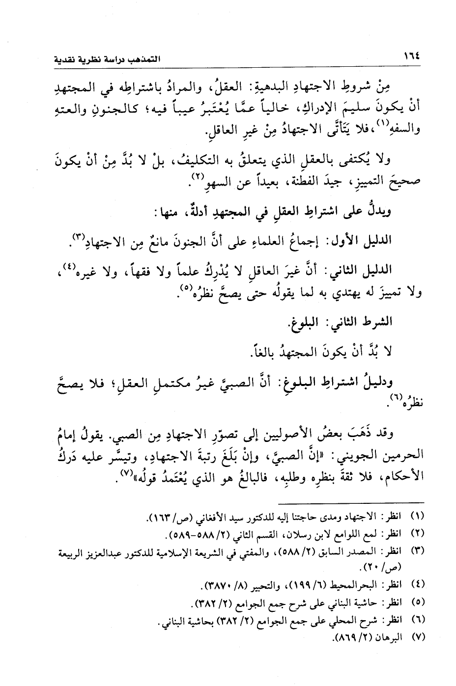 مِنْ شروطِ الاجتهادِ البدهيةِ: العقلُ، والمرادُ باشتراطِه في المجتهدِ أنْ يكونَ سليمَ الإدراكِ، خاليًا عمَّا يُعْتَبرُ عيبًا فيه؛ كالجنونِ والعتهِ والسفهِ (¬١)، فلا يَتَأتَّى الاجتهادُ مِنْ غيرِ العاقلِ.