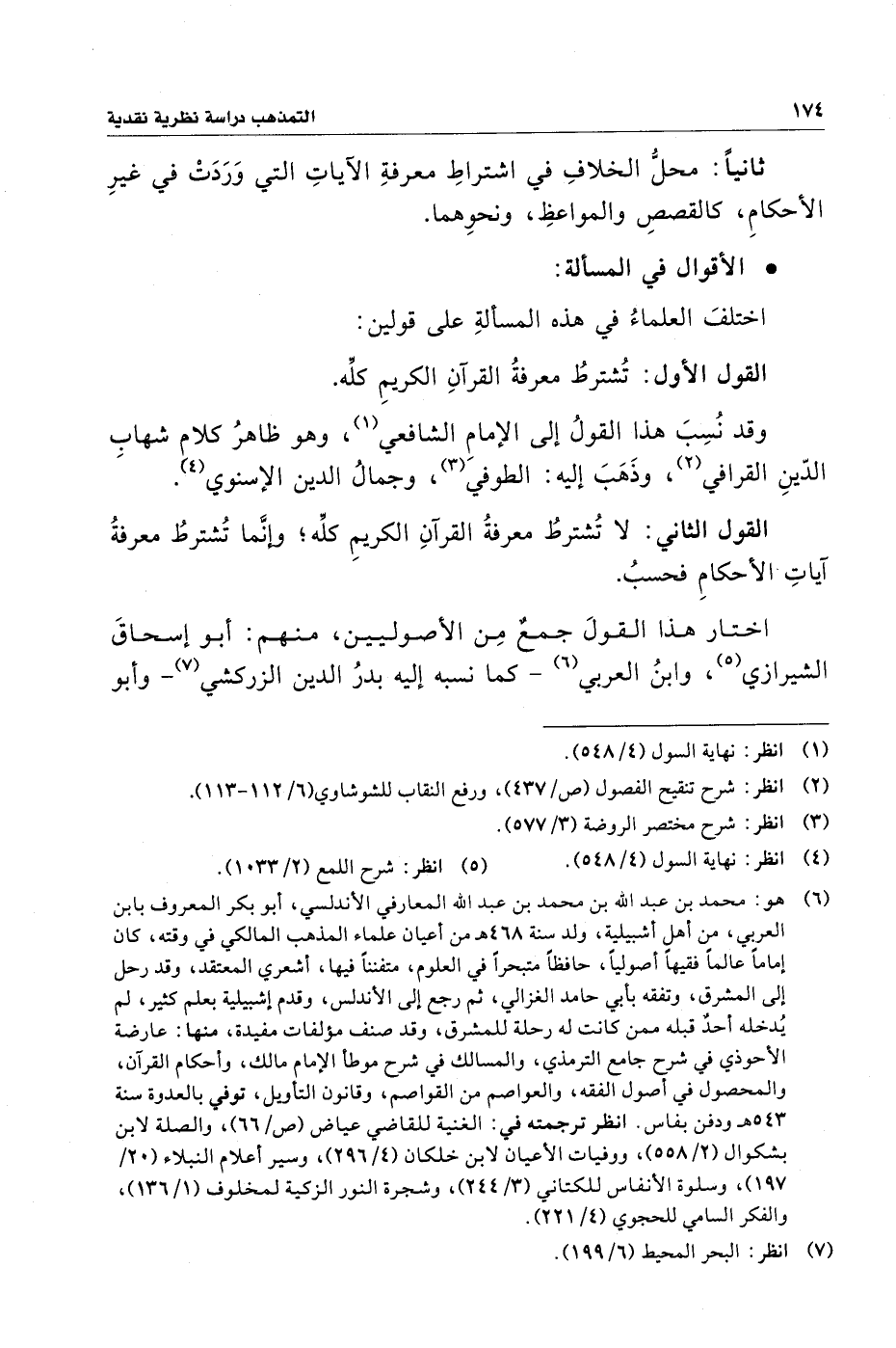 (¬٦) هو: محمد بن عبد الله بن محمد بن عبد الله المعارفي الأندلسي، أبو بكر المعروف بابن العربي، من أهل أشبيلية، ولد سنة ٤٦٨ هـ من أعيان علماء المذهب المالكي في وقته، كان إمامًا عالمًا فقيهًا أصوليًا، حافظًا متبحرًا في العلوم، متفننًا فيها، أشعري المعتقد، وقد رحل إلى المشرق، وتفقه بأبي حامد الغزالي، ثم رجع إلى الأندلس، وقدم إشبيلية بعلم كثير، لم يُدخله أحدٌ قبله ممن كانت له رحلة للمشرق، وقد صنف مؤلفات مفيدة، منها: عارضة الأحوذي في شرح جامع الترمذي، والمسالك في شرح موطأ الإمام مالك، وأحكام القرآن، والمحصول في أصول الفقه، والعواصم من القواصم، وقانون التأويل، توفي بالعدوة سنة ٥٤٣ هـ ودفن بفاس. انظر ترجمته في: الغنية للقاضي عياض (ص/ ٦٦)، والصلة لابن بشكوال (٢/ ٥٥٨)، ووفيات الأعيان لابن خلكان (٤/ ٢٩٦)، وسير أعلام النبلاء (٢٠/ ١٩٧)، وسلوة الأنفاس للكتاني (٣/ ٢٤٤)، وشجرة النور الزكية لمخلوف (١/ ١٣٦)، والفكر السامي للحجوي (٤/ ٢٢١).