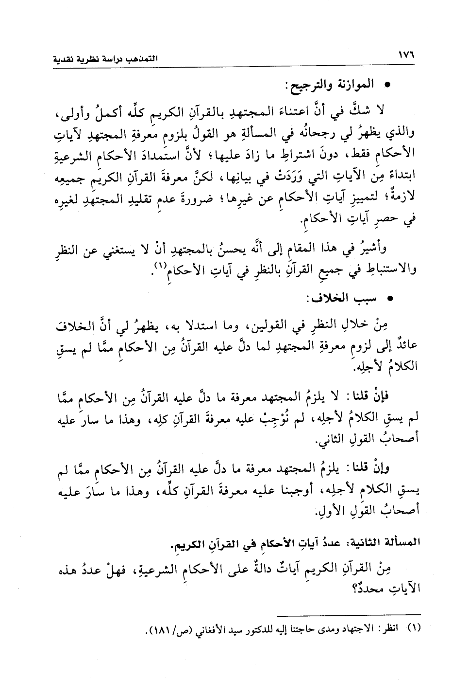 لا شكَّ في أنَّ اعتناءَ المجتهدِ بالقرآنِ الكريمِ كلِّه أكملُ وأولى، والذي يظهرُ لي رجحانُه في المسألةِ هو القولُ بلزومِ معرفةِ المجتهدِ لآياتِ الأحكامِ فقط، دونَ اشتراطِ ما زادَ عليها؛ لأنَّ استمدادَ الأحكامِ الشرعيةِ ابتداءً مِن الآياتِ التي وَرَدَت في بيانِها، لكنَّ معرفةَ القرآنِ الكريمِ جميعِه لازمةٌ؛ لتمييزِ آياتِ الأحكامِ عن غيرِها؛ ضرورةَ عدم تقليدِ المجتهدِ لغيرِه في حصرِ آياتِ الأحكامِ.