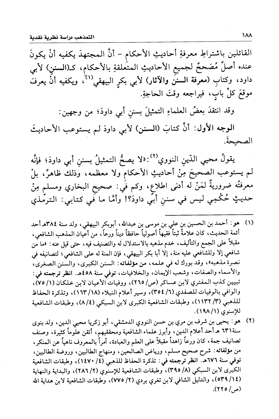 يقولُ محيي الدّينِ النووي (¬٢): "لا يصحُّ التمثيلُ بسننِ أبي داودَ؛ فإنَّه لم يستوعب الصحيحَ مِنْ أحاديثِ الأحكامِ ولا معظمه، وذلك ظاهرٌ، بلْ معرفتُه ضروريةٌ لمَنْ له أدنى اطلاع، وكم في: صحيحِ البخاري ومسلمٍ مِنْ حديثٍ حُكْمِي ليس في سننِ أبي داودَ؟ ! وأمَّا ما في كتابي: الترمذي