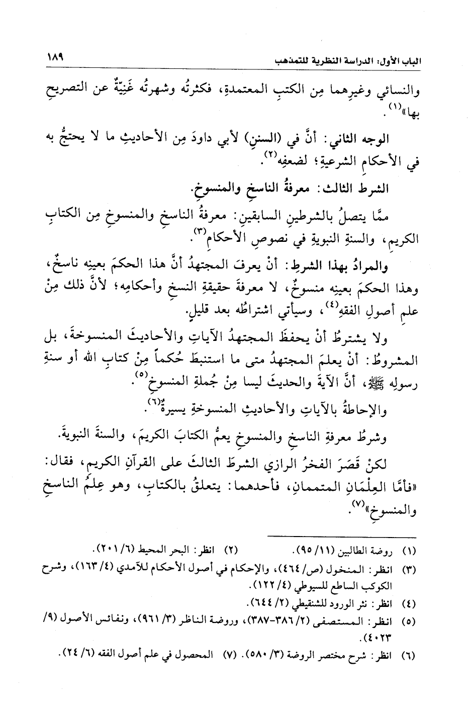 لكنْ قَصَرَ الفخرُ الرازي الشرطَ الثالثَ على القرآنِ الكريمِ، فقال: "فأمَّا العِلْمَانِ المتممانِ، فأحدهما: يتعلقُ بالكتابِ، وهو عِلمُ الناسخِ والمنسوخِ" (¬٧).