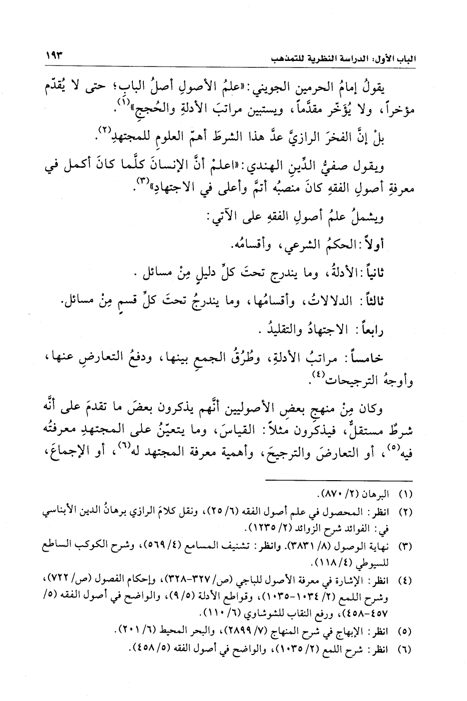 يقولُ إمامُ الحرمين الجويني: "علمُ الأصولِ أصلُ الباب؛ حتى لا يُقدّم مؤخرًا، ولا يُؤَخّر مقدَّمًا، ويستبين مراتبَ الأدلةِ والحُججِ" (¬١).