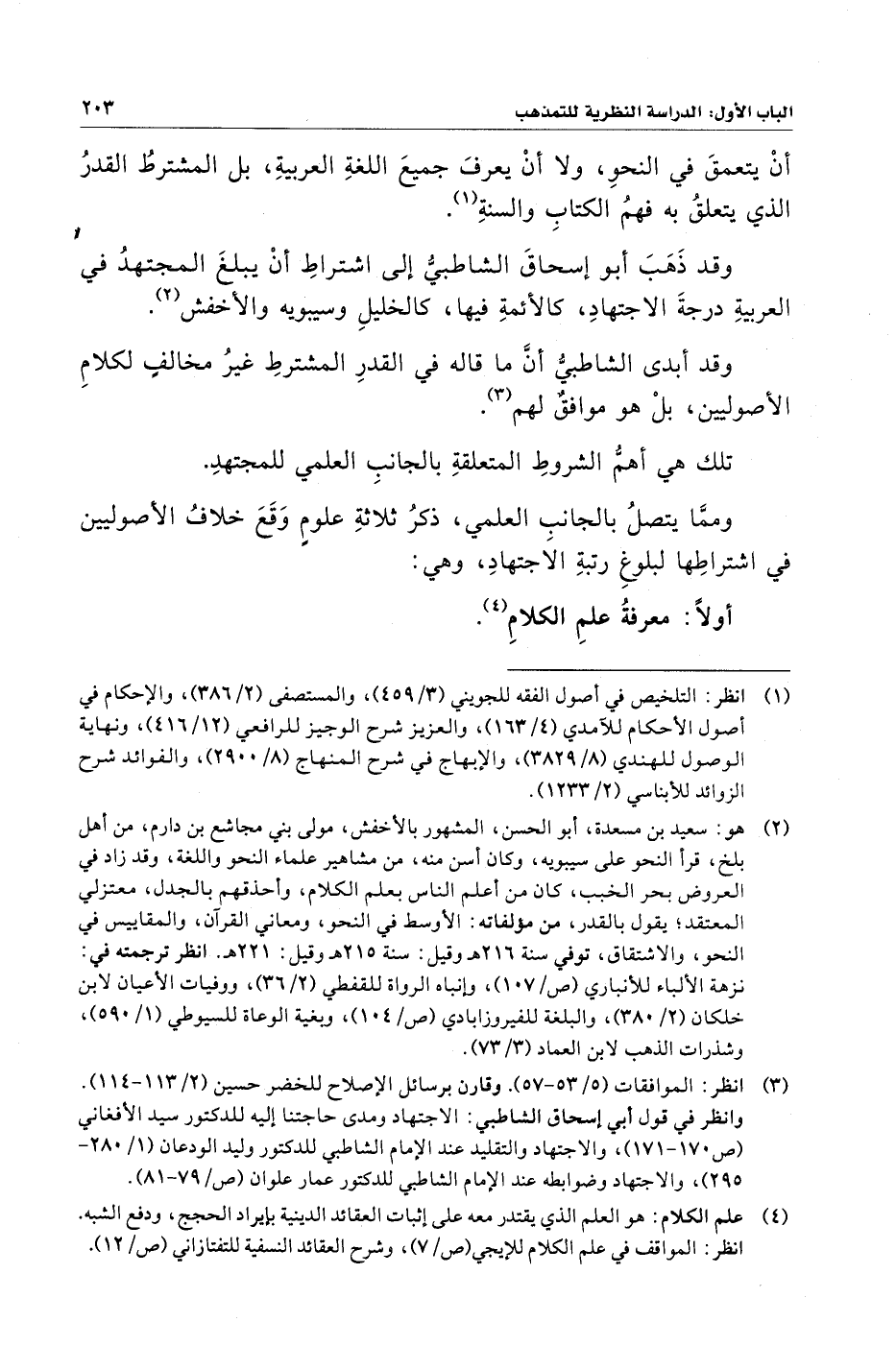 وقد ذَهَبَ أبو إسحاقَ الشاطبيُّ إلى اشتراطِ أنْ يبلغَ المجتهدُ في العربيةِ درجةَ الاجتهادِ، كالأئمةِ فيها، كالخليلِ وسيبويه والأخفش (¬٢).