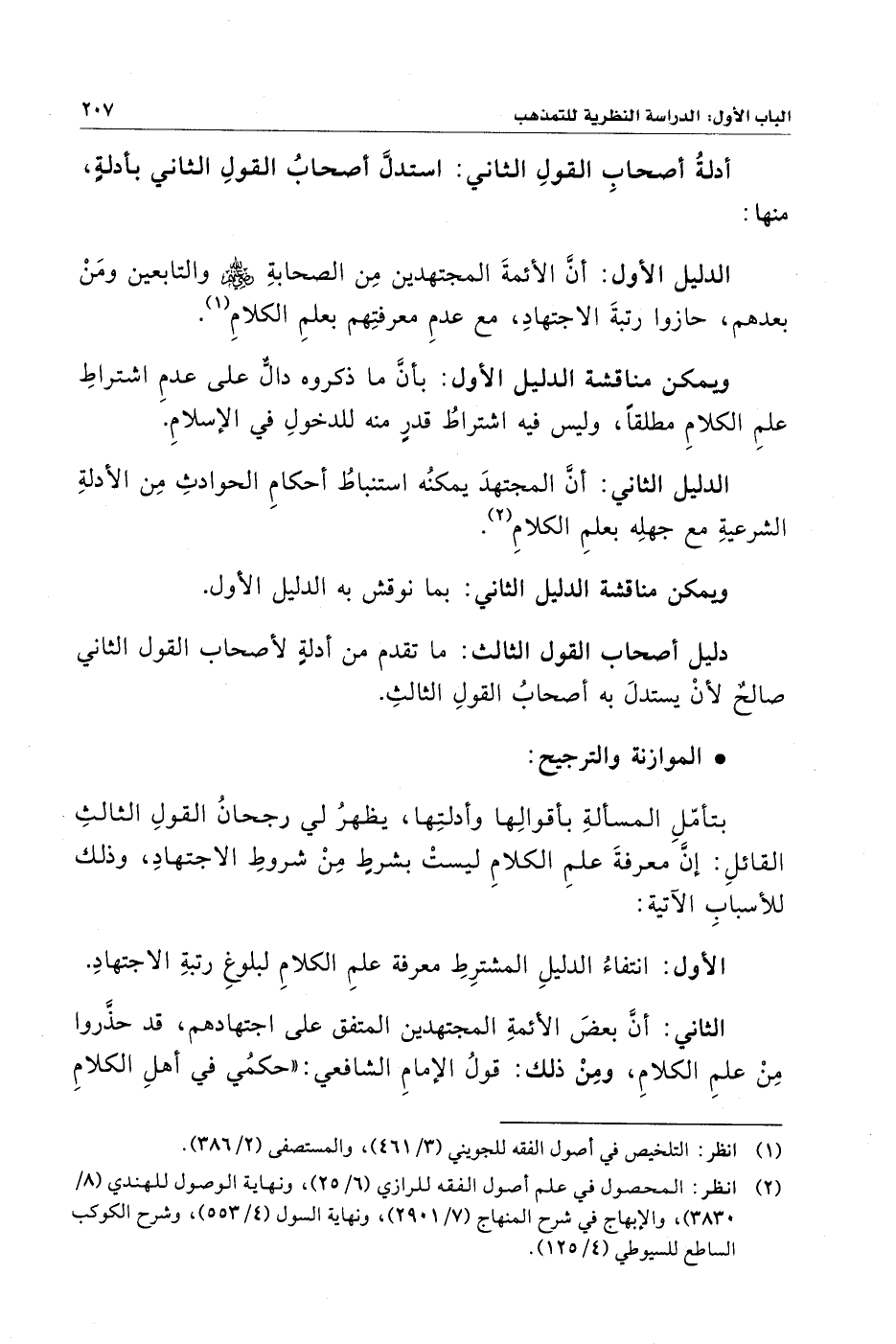 الأول: انتفاءُ الدليلِ المشترِطِ معرفة علمِ الكلامِ لبلوغِ رتبةِ الاجتهادِ.