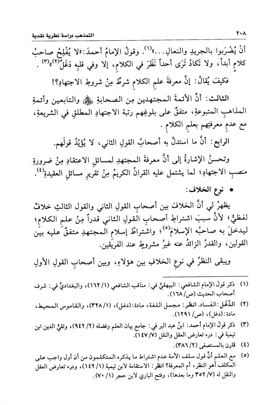 يظهرُ لي أنَّ الخلافَ بين أصحابِ القولِ الثاني والقول الثالثِ خلافٌ لفظيٌّ؛ لأنَّ سببَ اشتراطِ أصحابِ الَقولِ الثاني قدرًا مِنْ علمِ الكلامِ؛ ليدخلَ به صاحبُه الإسلامَ (¬٥)؛ واشتراطُ إسلامِ المجتهدِ متفقٌ عليه بين القولين، والقدرُ الزائدُ عنه غيرُ مشروطٍ عند الفريقين.