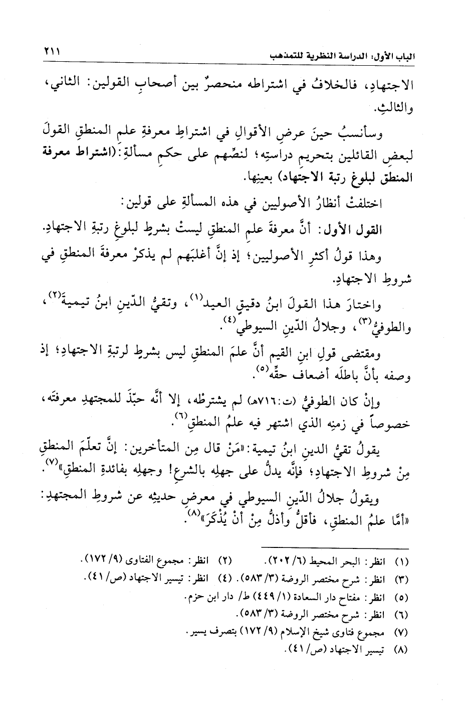 وإنْ كان الطوفيُّ (ت: ٧١٦ هـ) لم يشترطْه، إلا أنَّه حبّذَ للمجتهدِ معرفتَه، خصوصًا في زمنِه الذي اشتهر فيه علمُ المنطقِ (¬٦).