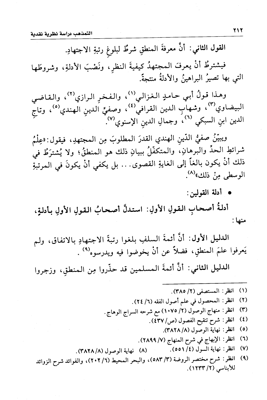 ويبيّنُ صفيُّ الدّينِ الهندي القدرَ المطلوبَ مِن المجتهدِ، فيقول: "عِلْمُ شرائطِ الحدِّ والبرهانِ، والمتكفلُ ببيانِ ذلك هو المنطقُ؛ ولا يُشترَطُ في ذلك أنْ يكون بالغًا إلى الغايةِ القصوى ... بل يكفي أنْ يكونَ في المرتبةِ الوسطى مِنْ ذلك" (¬٨).