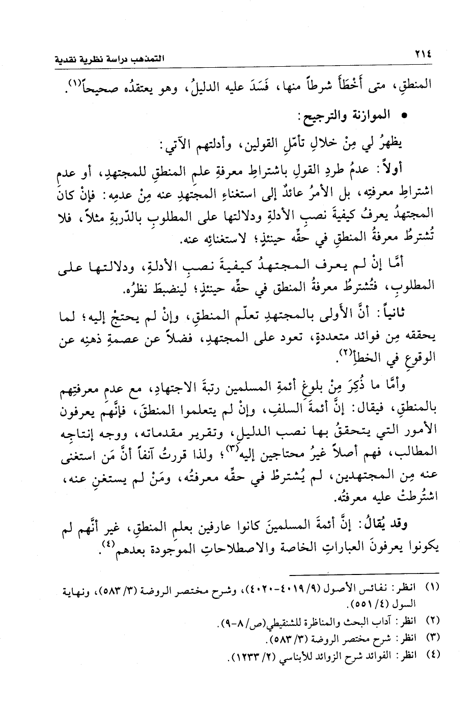 ثانيًا: أنَّ الأَولى بالمجتهدِ تعلّم المنطقِ، وإنْ لم يحتجْ إليه؛ لما يحققه مِن فوائد متعددةٍ، تعود على المجتهدِ، فضلًا عن عصمةِ ذهنِه عن الوقوعِ في الخطأِ (¬٢).