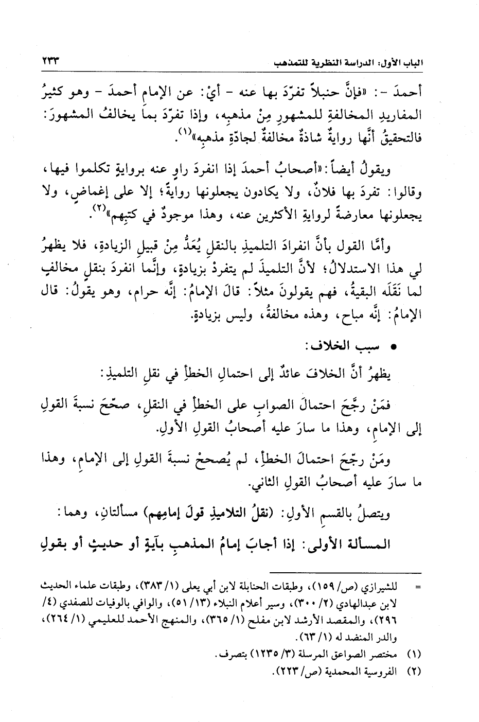 وأمَّا القول بأنَّ انفرادَ التلميذِ بالنقلِ يُعَدُّ مِنْ قبيلِ الزيادةِ، فلا يظهرُ لي هذا الاستدلالُ؛ لأنَّ التلميذَ لم يتفردْ بزيادةٍ، وإنَّما انفردَ بنقلٍ مخالفٍ لما نَقَلَه البقيةُ، فهم يقولونَ مثلًا: قالَ الإمامُ: إنَّه حرام، وهو يقولُ: قال الإمامُ: إنَّه مباح، وهذه مخالفةُ، وليس بزيادةٍ.