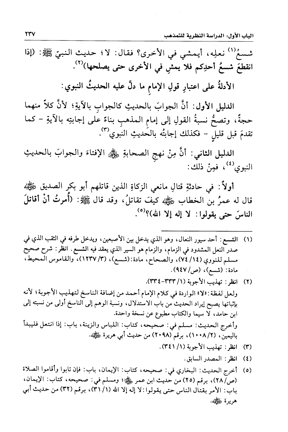 الدليل الأول: أنَّ الجوابَ بالحديثِ كالجوابِ بالآيةِ؛ لأنَّ كلًّا منهما حجةٌ، وتصحُّ نسبةُ القولِ إلى إمامِ المذهبِ بناءً على إجابتِه بالآيةِ - كما تقدمَ قبل قليلٍ - فكذلك إجابتُه بالحديثِ النبوي (¬٣).