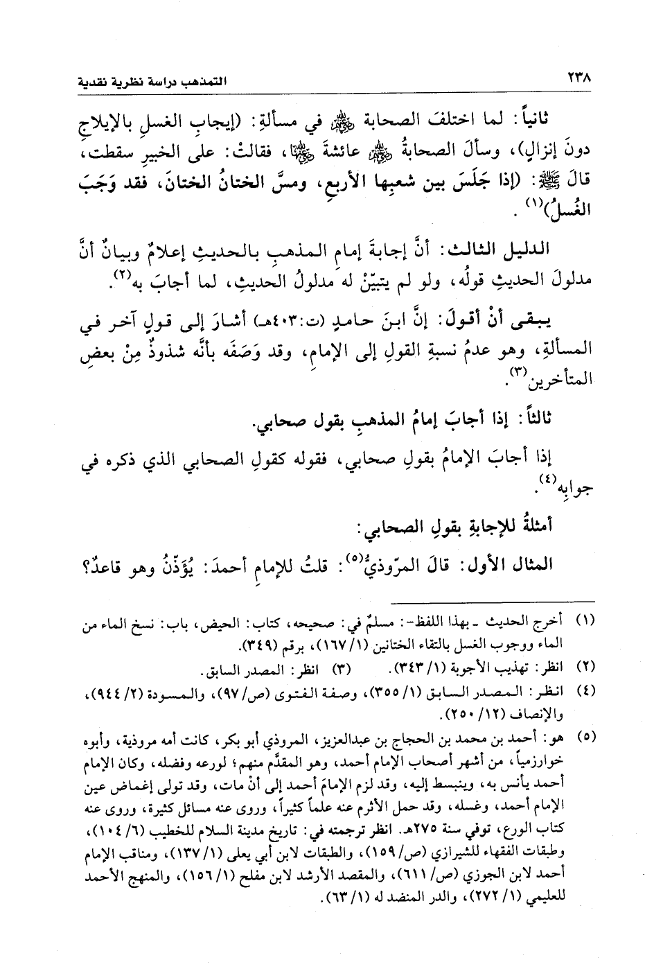 الدليل الثالث: أنَّ إجابةَ إمامِ المذهب بالحديثِ إعلامٌ وبيانٌ أنَّ مدلولَ الحديثِ قولُه، ولو لم يتبيّنْ له مدلولُ الحَديثِ، لما أجابَ به (¬٢).