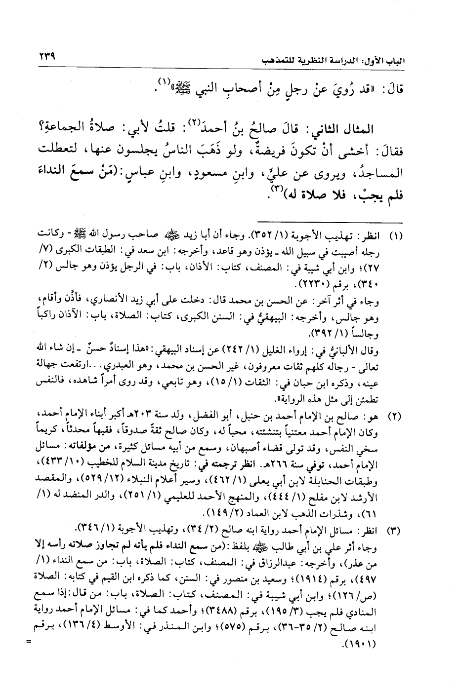 المثال الثاني: قالَ صالح بنُ أحمدَ (¬٢): قلتُ لأبي: صلاةُ الجماعةِ؟ فقالَ: أخشى أنْ تكونَ فريضةٌ، ولو ذَهَبَ الناسُ يجلسون عنها، لتعطلت المساجدُ، ويروى عن عليٍّ، وابنِ مسعودٍ، وابنِ عباسٍ: (مَنْ سمعَ النداءَ فلم يجبْ، فلا صلاة له) (¬٣).