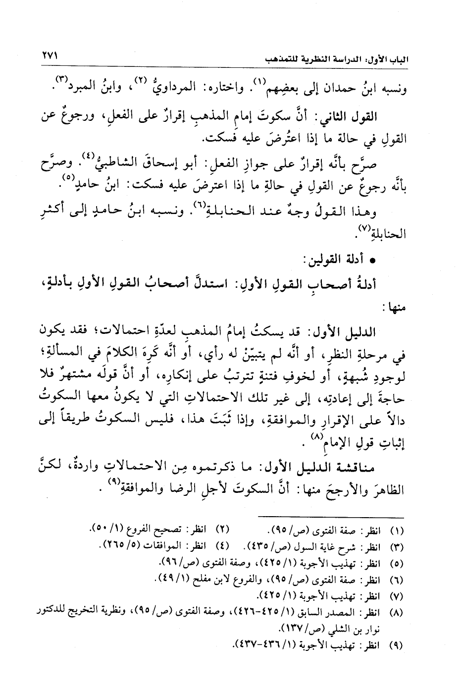 الدليل الأول: قد يسكتُ إمامُ المذهبِ لعدّةِ احتمالات؛ فقد يكون في مرحلةِ النظرِ، أو أنَّه لم يتبيّنْ له رأي، أو أنَّه كَرِهَ الكلامَ في المسألةِ؛ لوجودِ شُبهةٍ، أو لخوفِ فتنةٍ تترتبُ على إنكارِه، أو أنَّ قولَه مشتهرٌ فلا حاجةَ إلى إعادتِه، إلى غير تلك الاحتمالاتِ التي لا يكونُ معها السكوتُ دالًا على الإقرارِ والموافقةِ، وإذا ئَبَتَ هذا، فليس السكوتُ طريقًا إلى إثباتِ قولِ الإمامِ (¬٨).