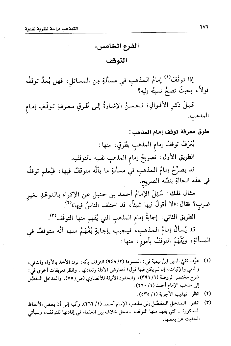 (¬١) عرَّف تقيُّ الدين بنُ تيمية في: المسودة (٢/ ٩٤٨) التوقف بأنه: ترك الأخذ بالأول والثاني، والنفي والإثبات، إن لم يكن فيها قول؛ لتعارض الأدلة وتعادلها. وانظر تعريفات أخرى في: شرح مختصر الروضة (١/ ٣٩١)، والحدود الأنيقة للأنصاري (ص/ ٧٥)، والمدخل المفصَّل إلى مذهب الإمام أحمد (١/ ٢٦٠).
