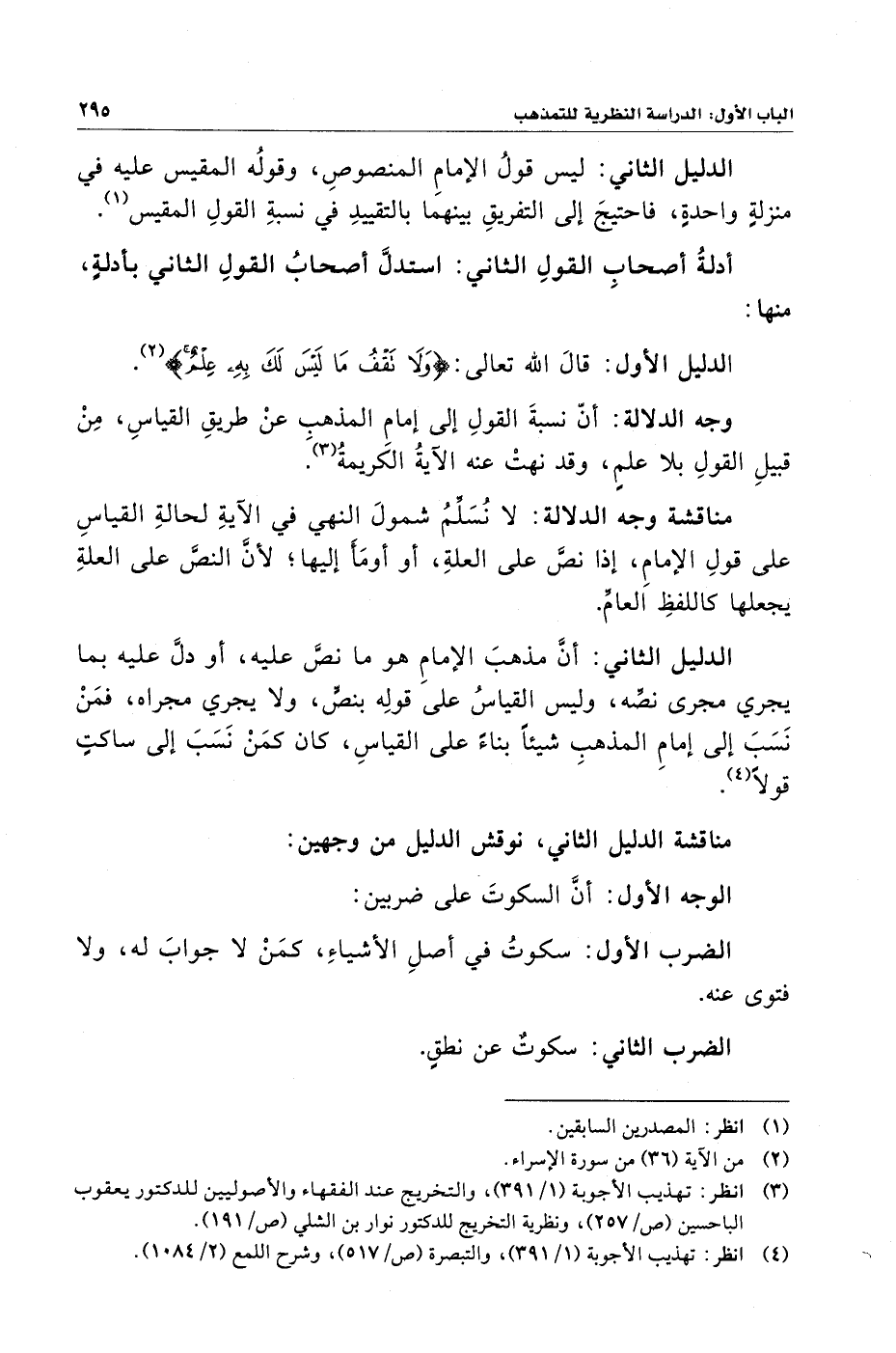 وجه الدلالة: أنّ نسبةَ القولِ إلى إمامِ المذهبِ عنْ طريقِ القياسِ، مِنْ قبيلِ القولِ بلا علمٍ، وقد نهتْ عنه الآيةُ الكريمةُ (¬٣).