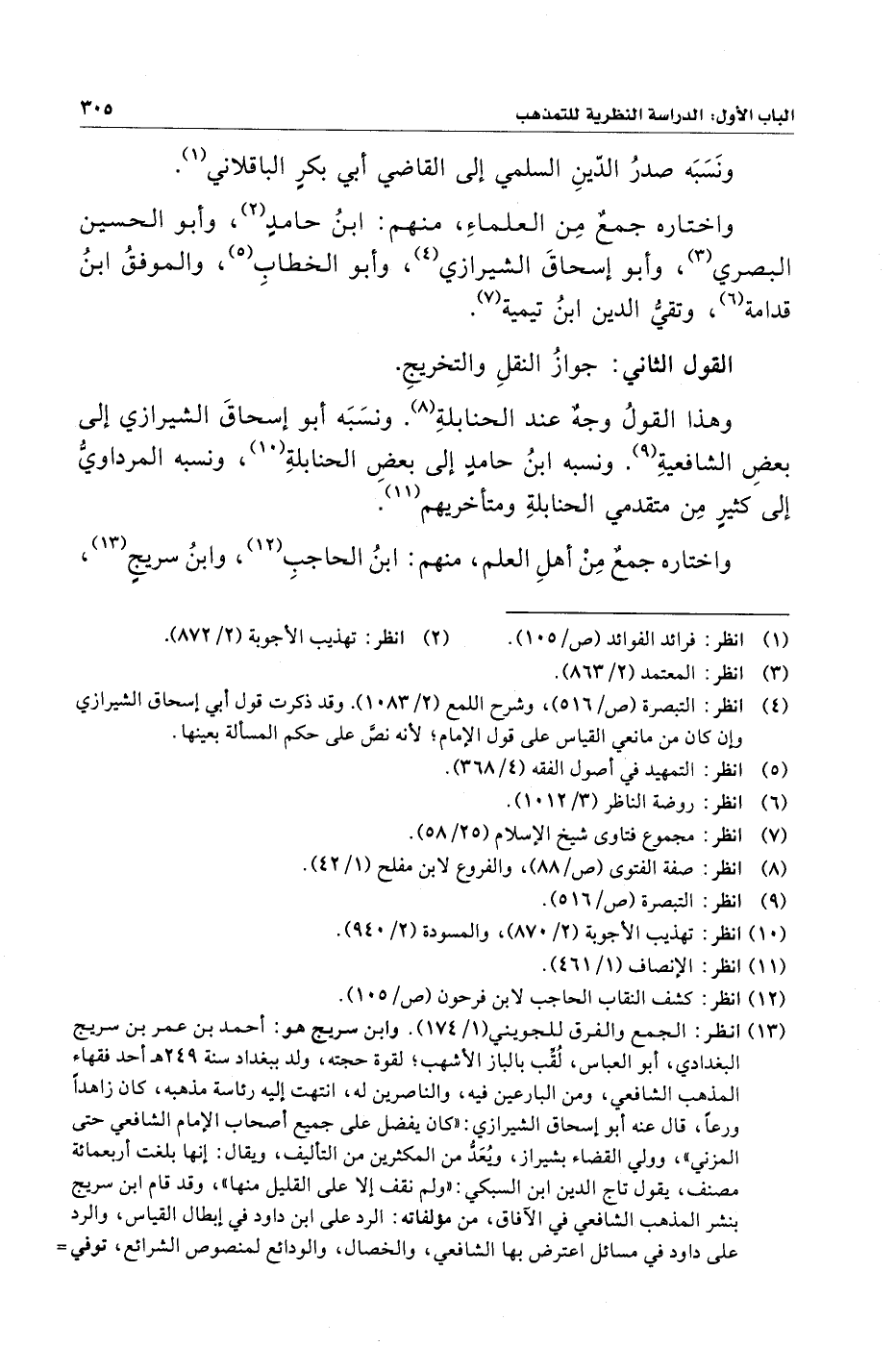 (¬١٣) انظر: الجمع والفرق للجويني (١/ ١٧٤). وابن سريج هو: أحمد بن عمر بن سريج البغدادي، أبو العبَّاس، لُقب بالباز الأشهب؛ لقوة حجته، ولد ببغداد سنة ٢٤٩ هـ أحد فقهاء المذهب الشَّافعي، ومن البارعين فيه، والناصرين له، انتهت إِليه رئاسة مذهبه، كان زاهدًا ورعًا، قال عنه أبو إِسحاق الشيرازي: "كان يفضل على جميع أصحاب الإِمام الشَّافعي حتى المزني"، وولي القضاء بشيراز، ويُعَدُّ من المكثرين من التأليف، ويقال: إِنها بلغت أربعمائة مصنف، يقول تاج الدين بن السبكي: "ولم نقف إِلَّا على القليل منها"، وقد قام ابن سريج بنشر المذهب الشَّافعي في الآفاق، من مؤلفاته: الرد على ابن داود في إِبطال القياس، والرد على داود في مسائل اعترض بها الشَّافعي، والخصال، والودائع لمنصوص الشرائع، توفي =