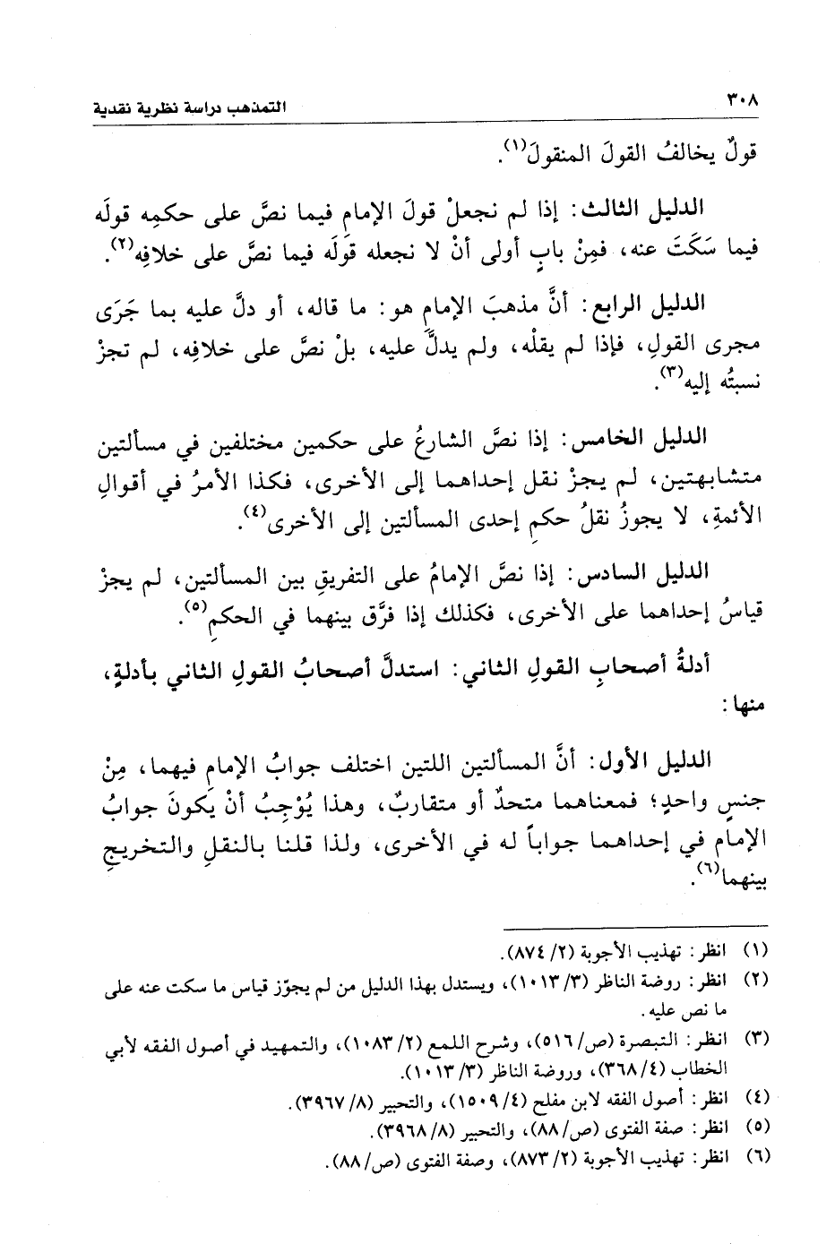 الدليل الخامس: إِذا نصَّ الشارعُ على حكمين مختلفين في مسألتين متشابهتين، لم يجزْ نقل إِحداهما إِلى الأخرى، فكذا الأمرُ في أقوالِ الأئمةِ، لا يجوزُ نقلُ حكمِ إِحدى المسألتين إِلى الأخرى (¬٤).