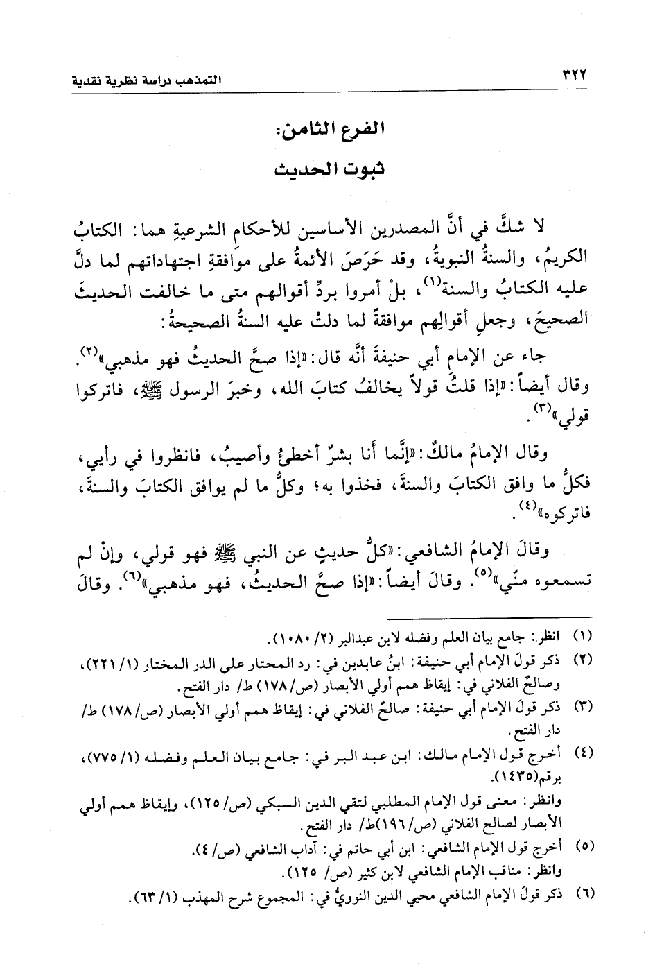 وقالَ الإِمامُ الشَّافعي: "كلُّ حديثٍ عن النبي - صلى الله عليه وسلم - فهو قولي، وإِنْ لم تسمعوه منّي" (¬٥). وقالَ أيضًا: "إِذا صحَّ الحديثُ، فهو مذهبي" (¬٦). وقالَ