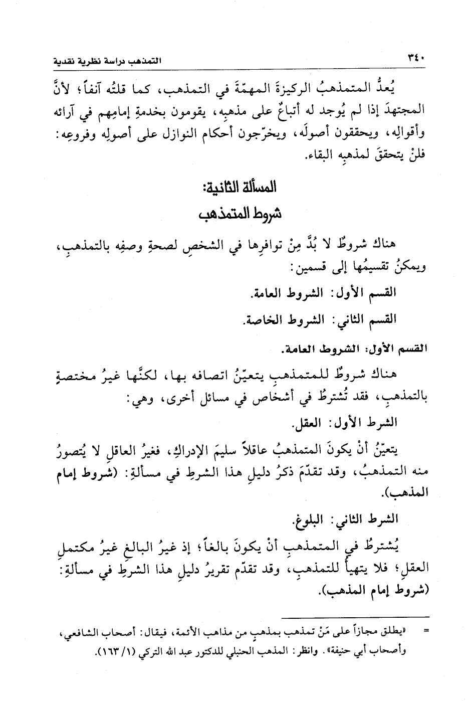 هناك شروطٌ لا بُدَّ مِنْ توافرِها في الشخصِ لصحةِ وصفِه بالتمذهبِ، ويمكنُ تقسيمُها إلى قسمين:
